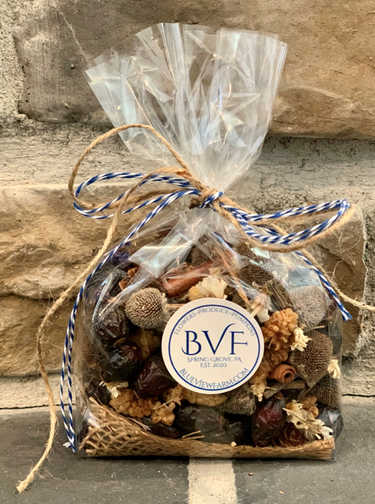 Our potpourri is made by hand and highly fragrant. Each bag comes wrapped and ready to gift. Available scents: White Lilac, Orange Spice, Mountain Blueberry, and our signature scent, House.