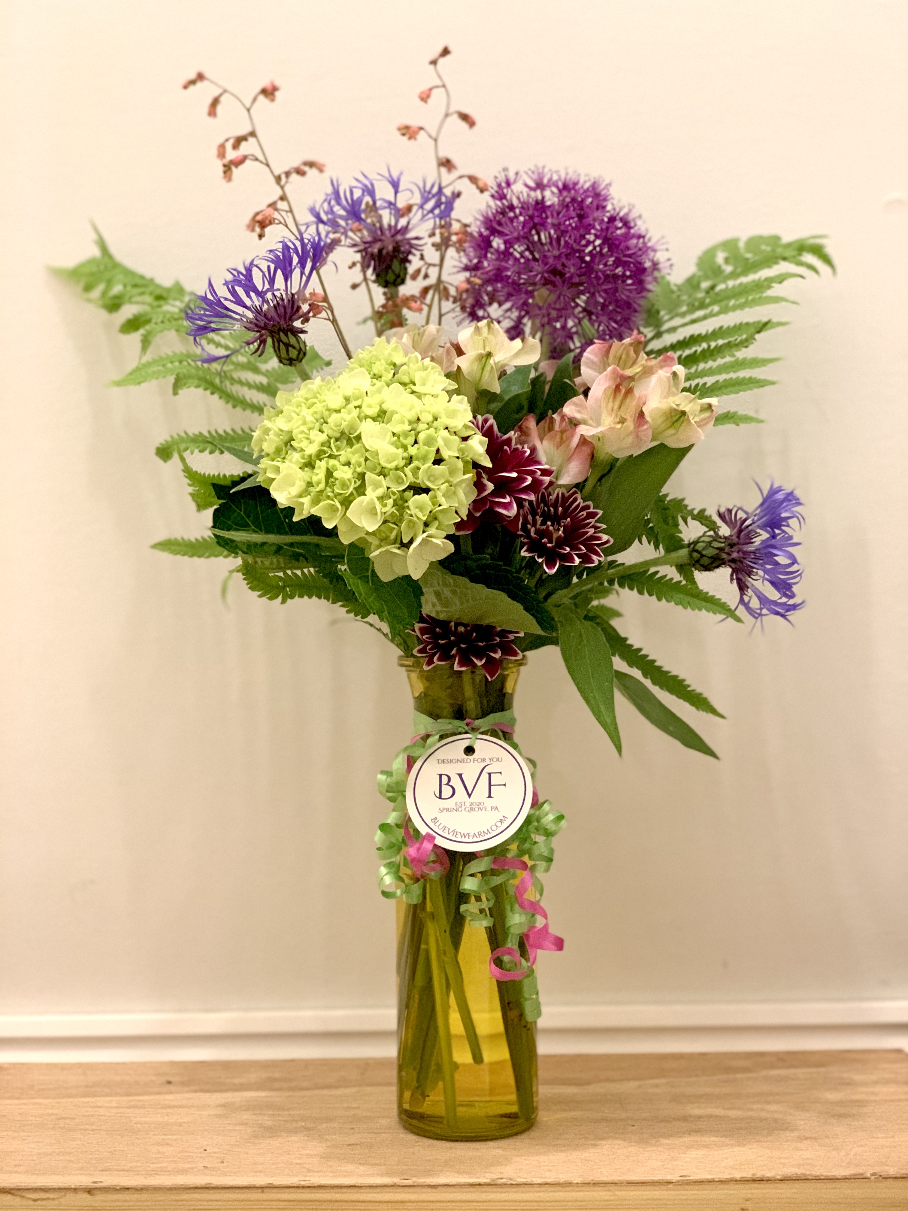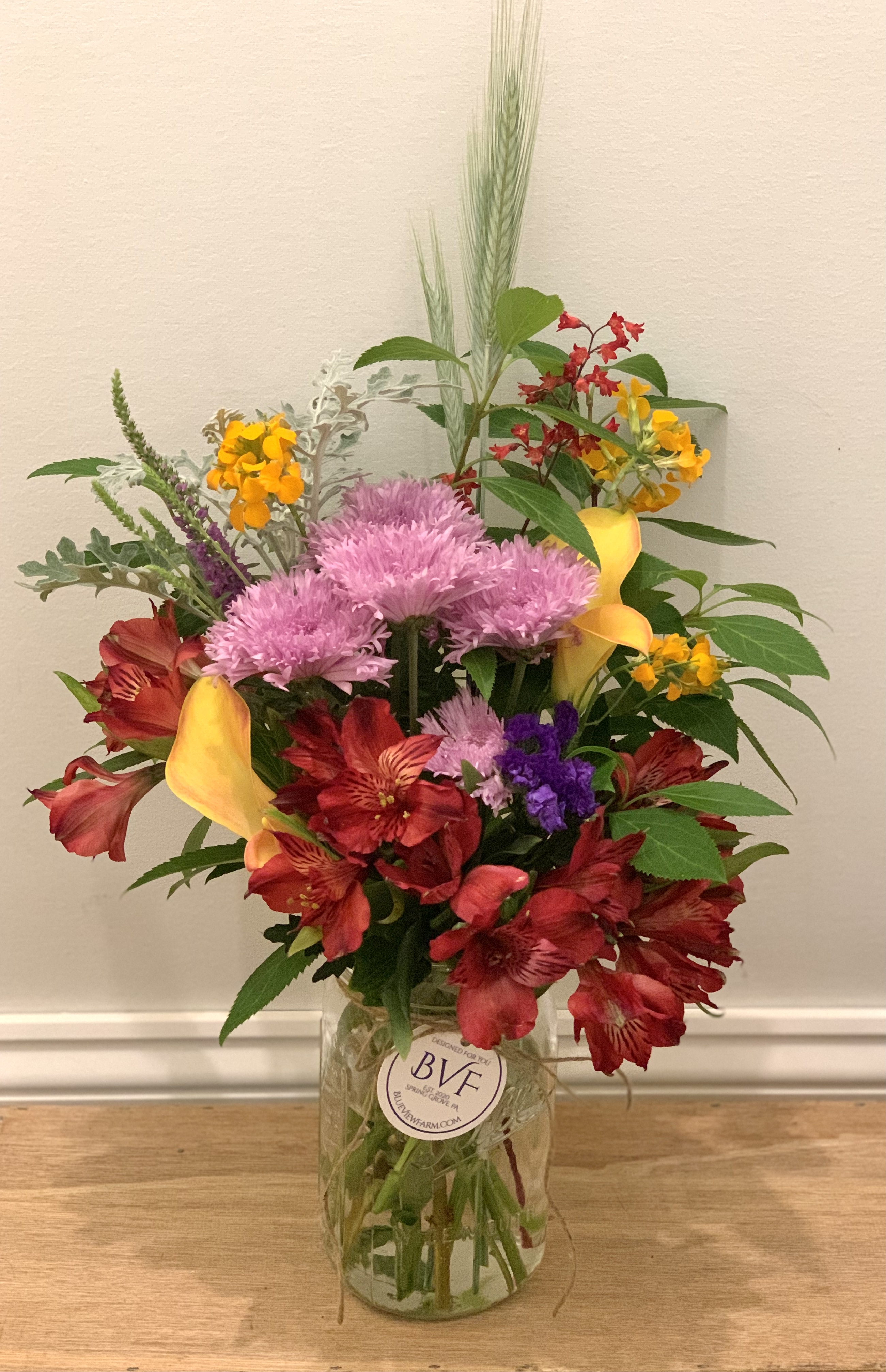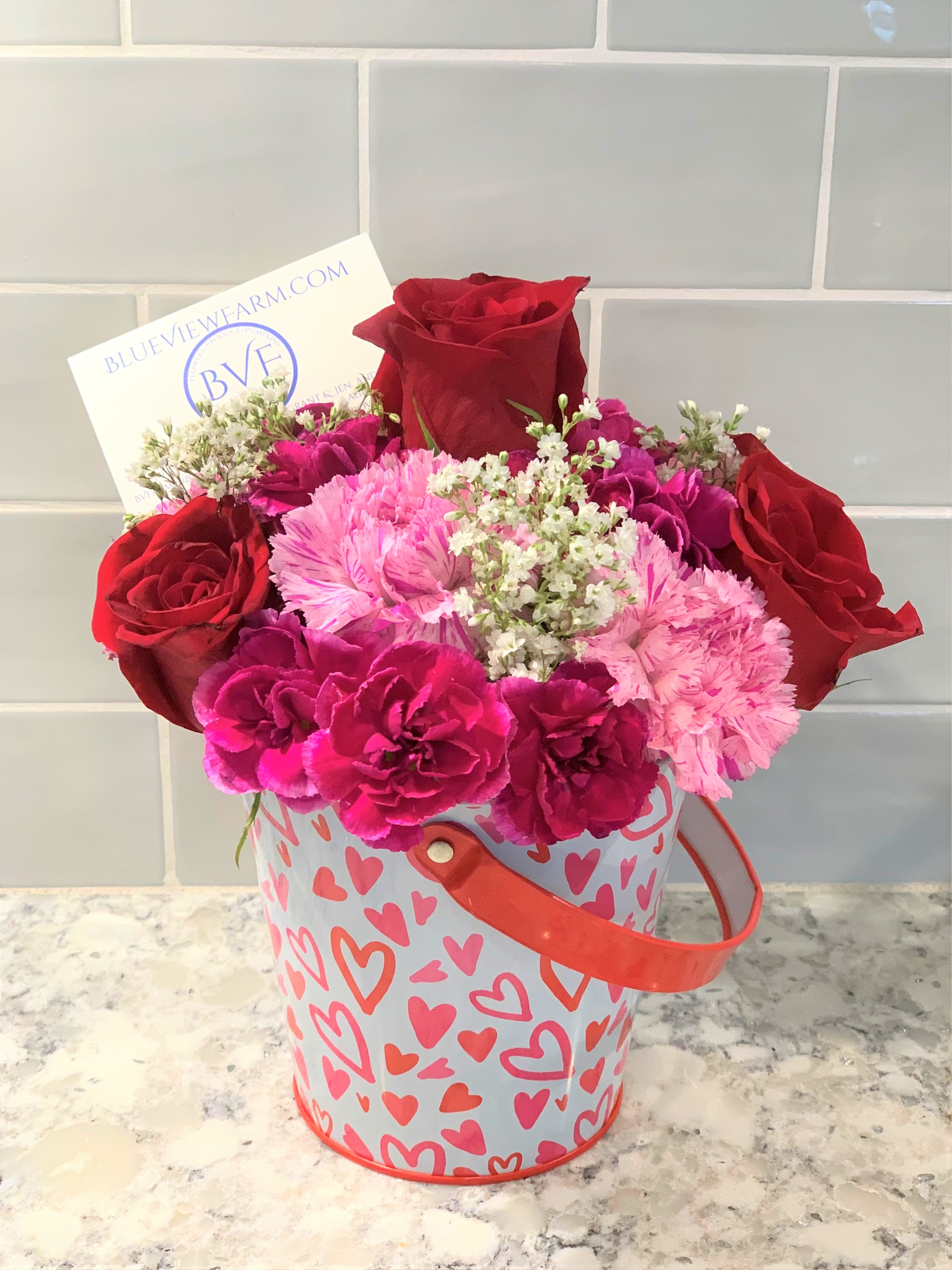 Two roses, carnations, baby’s breath and greens. 9.5″ vase included. Colors may vary. Pick up at Blue View Farm.