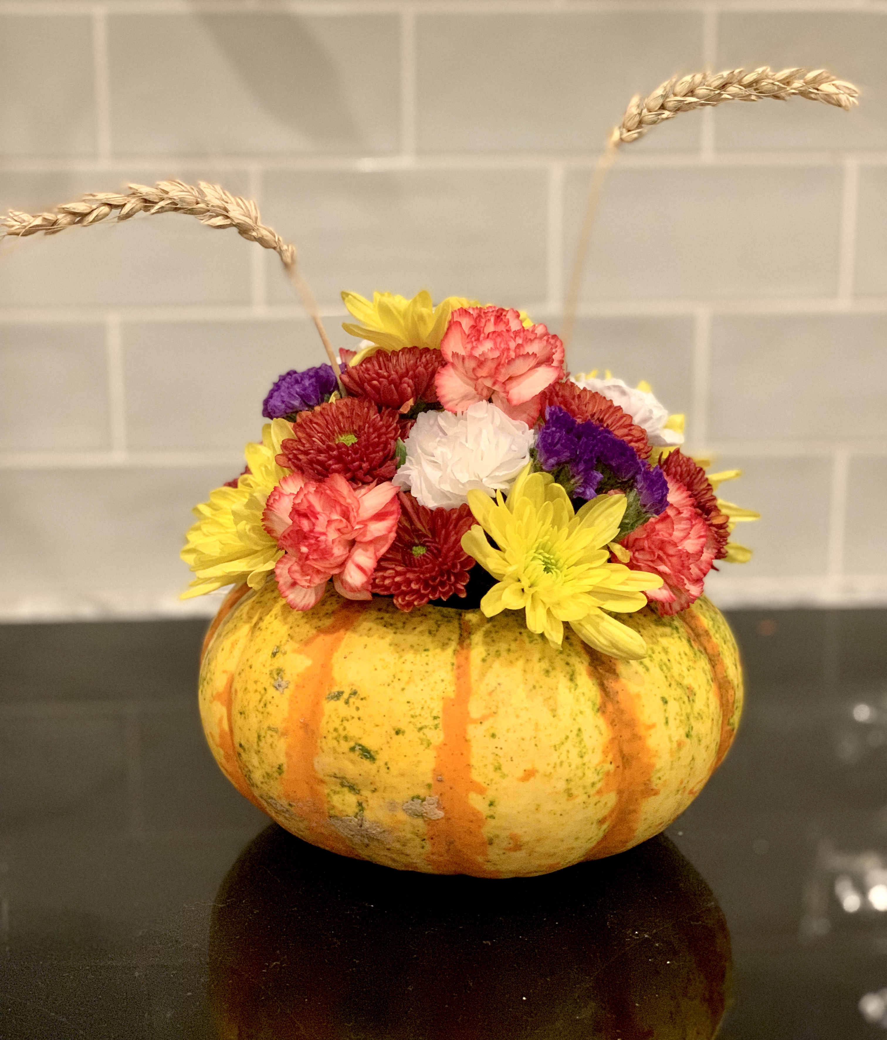 This medium size pumpkin arrangement is the perfect size to still allow conversations across the table. Also the perfect size for the corner of a desk. Pumpkin color and flowers will vary. September-November