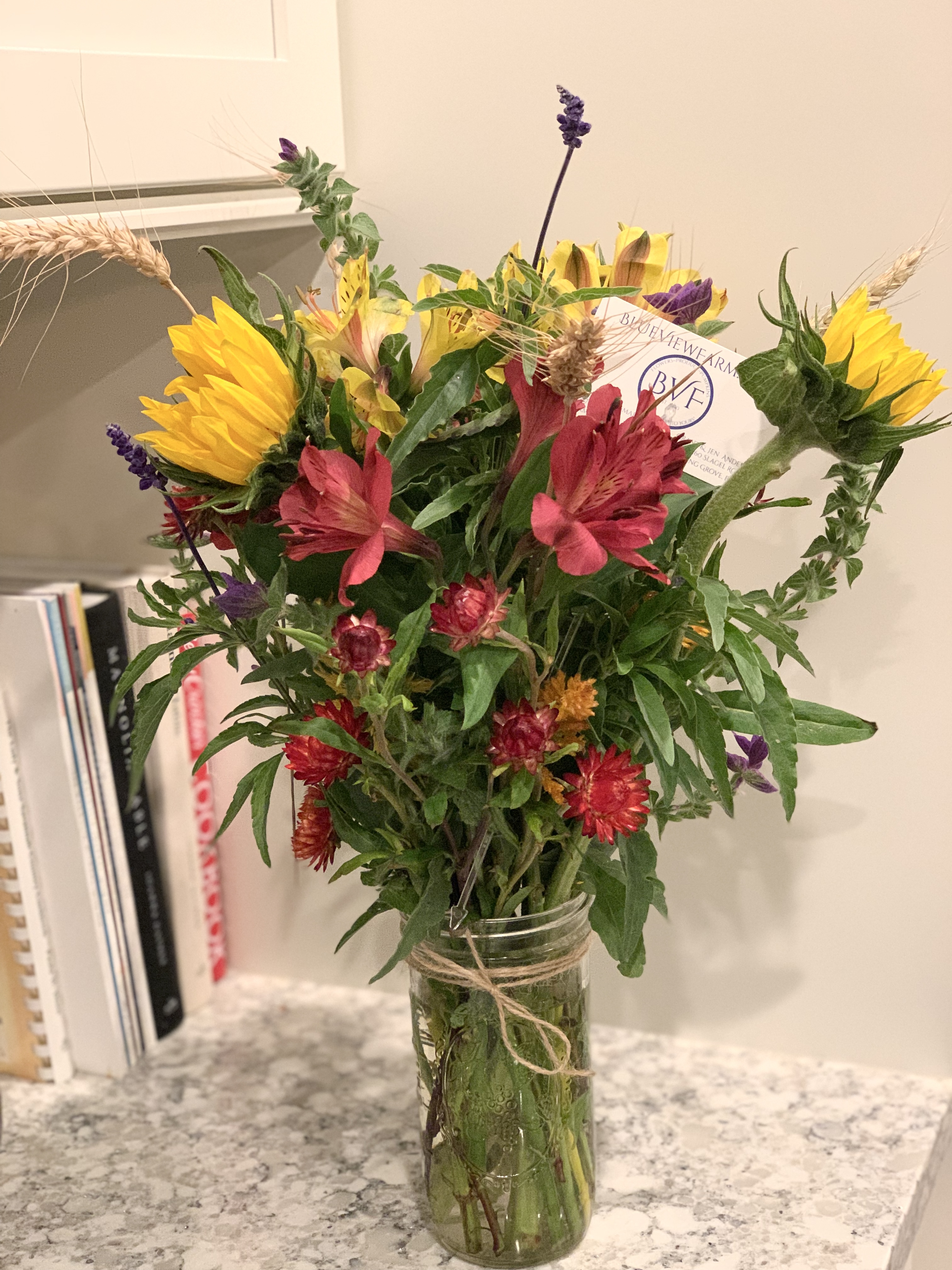 Seasonal flowers beautifully arranged in a wide-mouth mason jar.