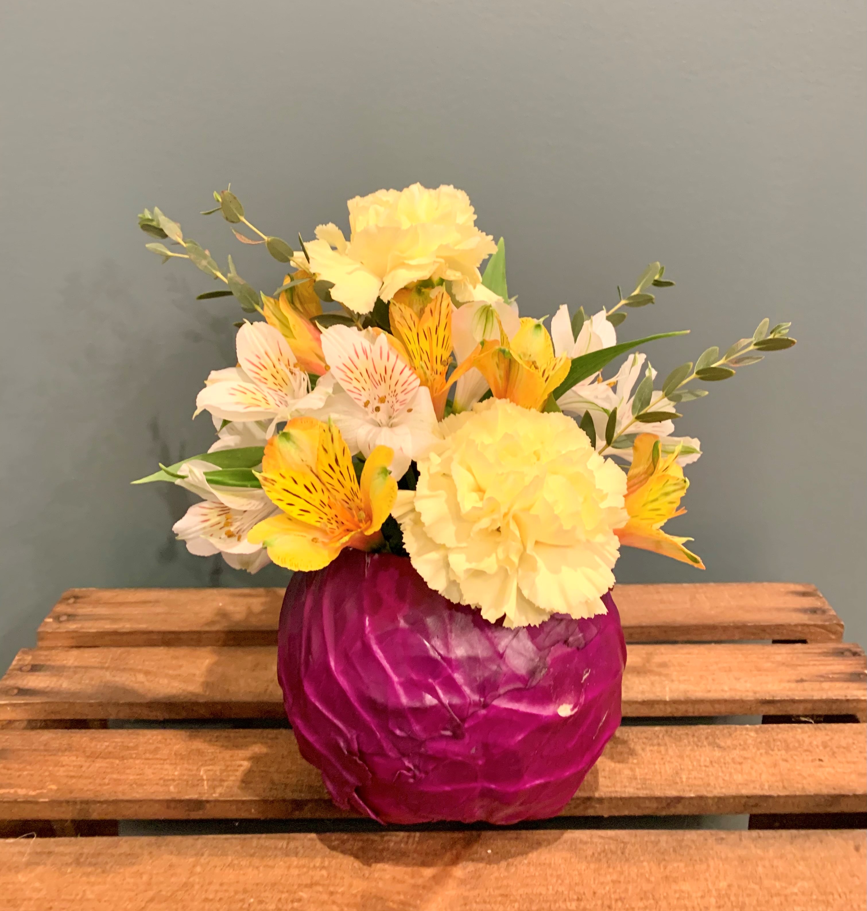 Celebrate spring with this fresh idea! Nestled in a purple cabbage is a beautiful arrangement of seasonal flowers.