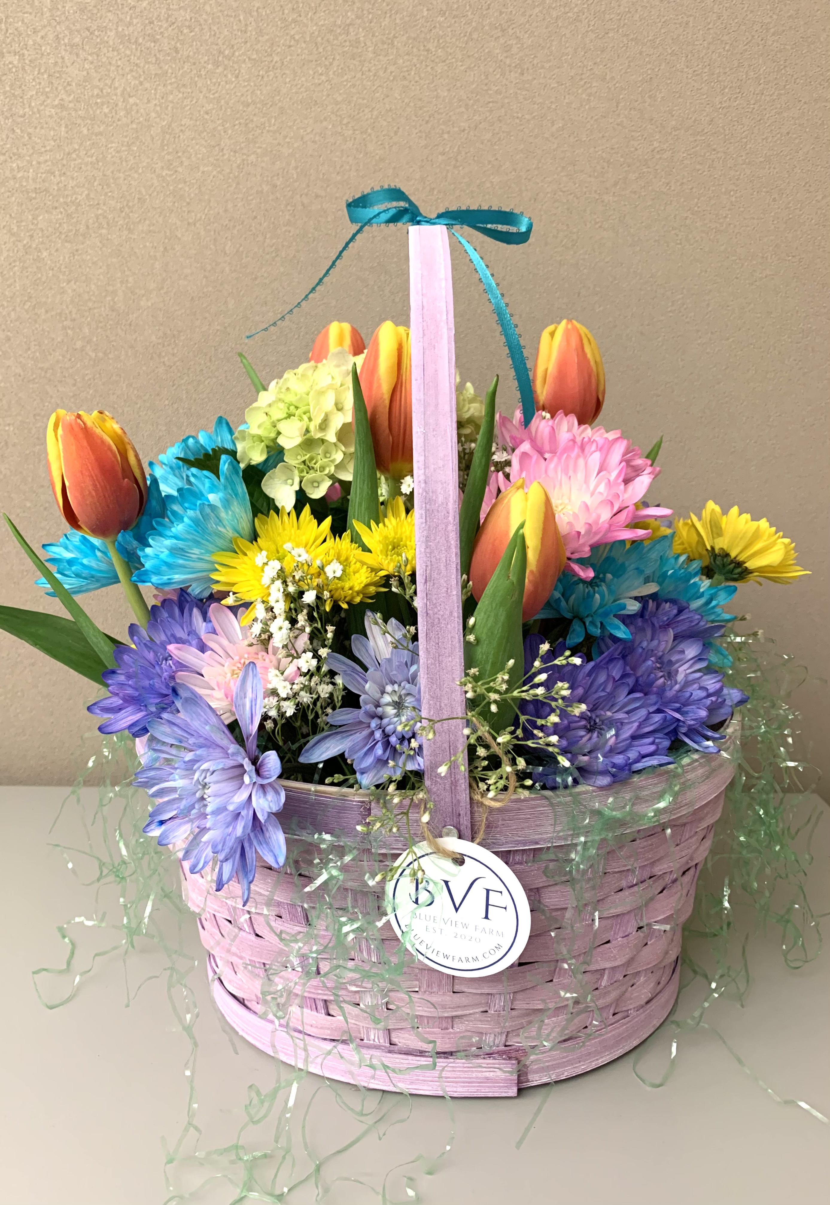 Green, Pink, or Purple basket filled with seasonal flowers which may include mums, tulips, or carnations. Basket measures 10″x14″. Colors may vary. Pick up at Blue View Farm.