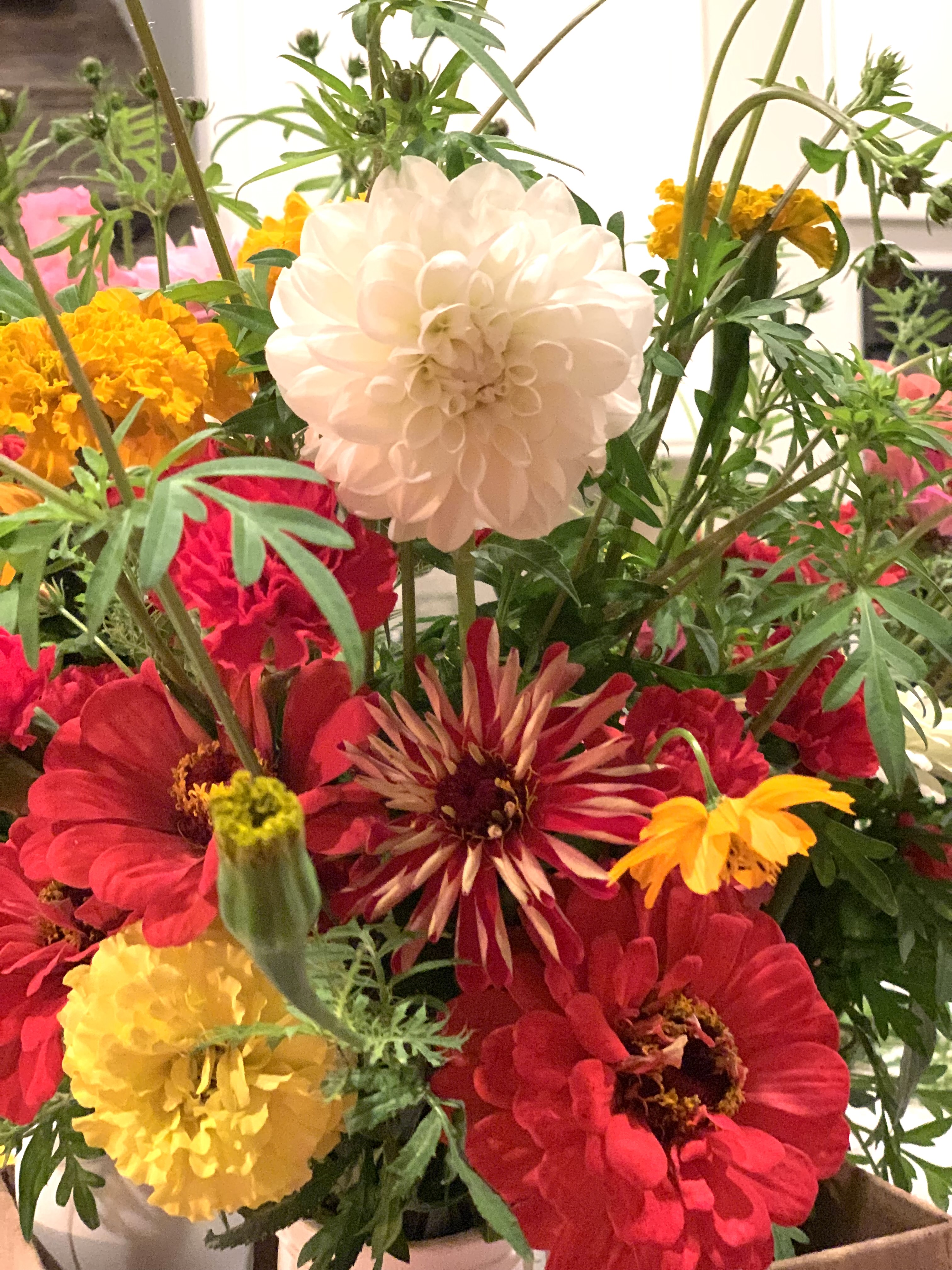 Summer Bouquet Subscription– Pick up 4 bouquets of Summer blooms June-July: $60 -This option offers the most variety including marigolds, zinnias, bachelor buttons, poppy, strawflower, pincusion flower, and snapdragons.