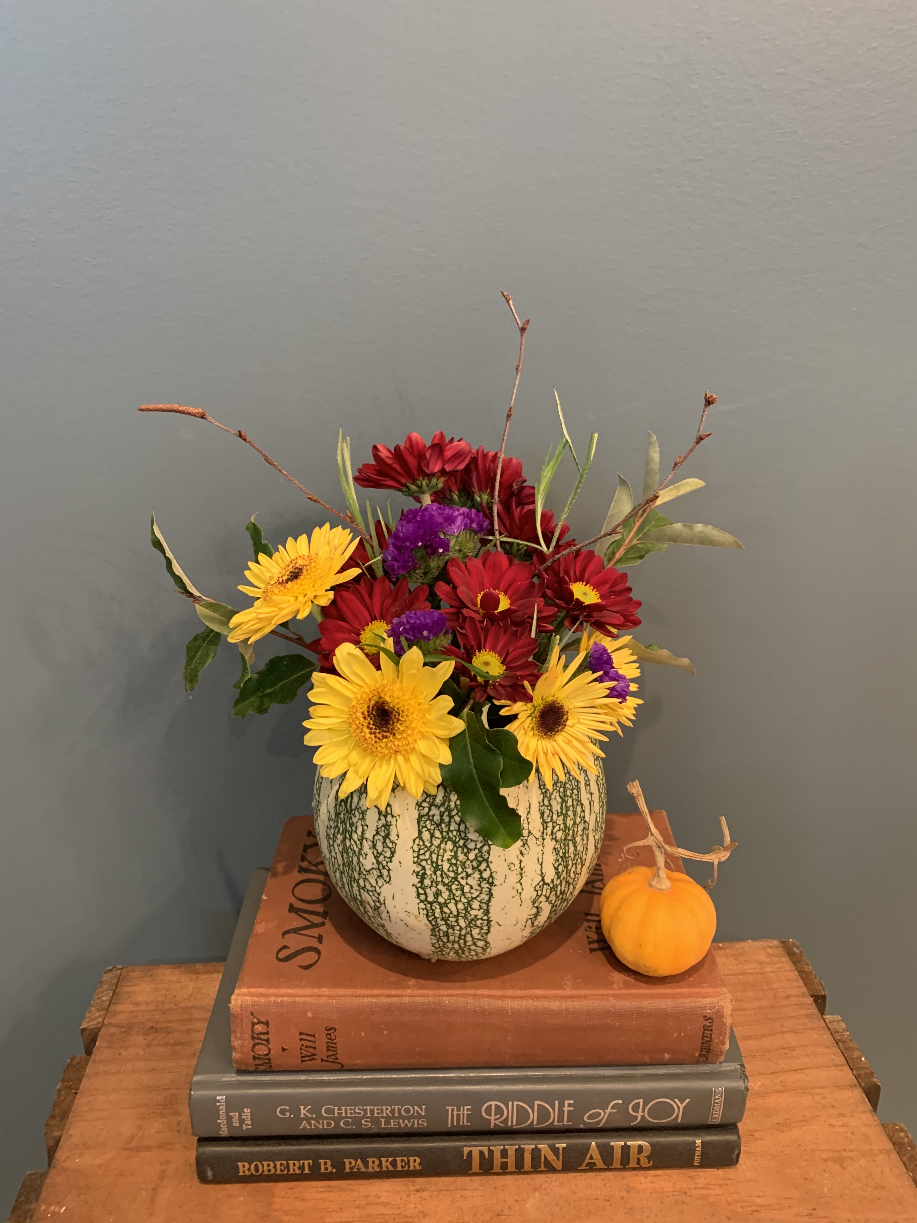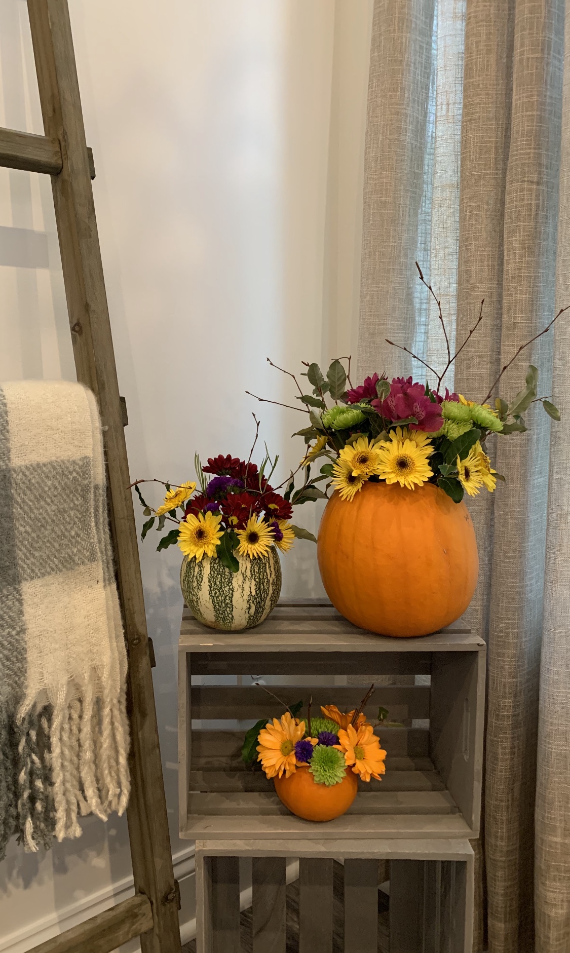 Note: Each person will leave with one pumpkin arrangement, approximately 8″x 8″ with some larger and smaller options available to fit your vision. It takes about an hour to make one pumpkin. Pumpkins last about 1 week at room temperature and even longer if kept refrigerated. The workshop room is upstairs (no elevator).